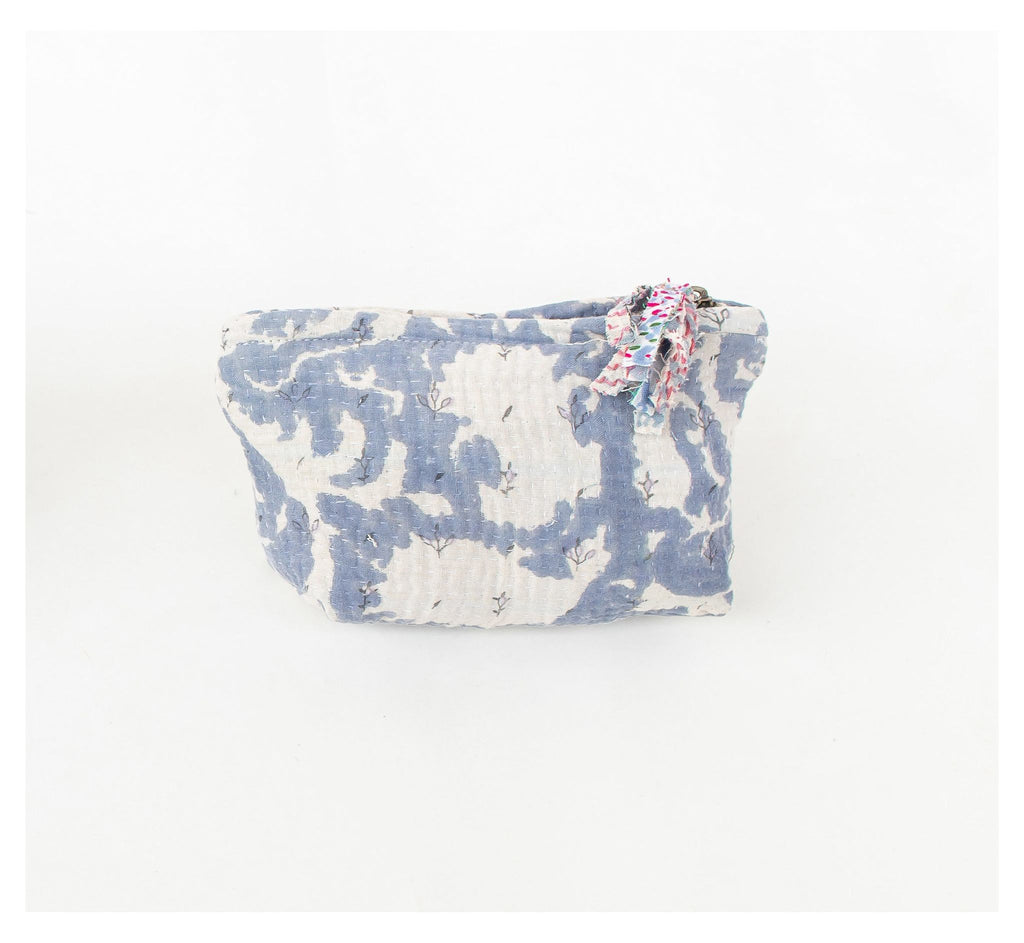 Details: Material: 100% vintage sari fabric (white/cream with block print), Size: 12 × 20 cm, Closure: durable zipper, Origin: handmade in India