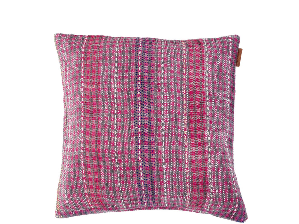 Fine Q are Sari cushions produced from a type of sari that has a different expression than our normal Sari Kantha cushions. They are made of thick recycled cotton sari laid together with several layers in between and with a worn look, where the saris inside help to give the whole pillow a very raw vintage look. They are toned down in colors and patterns and are sewn with smaller and tighter Kantha stitches, which give them an authentic look..