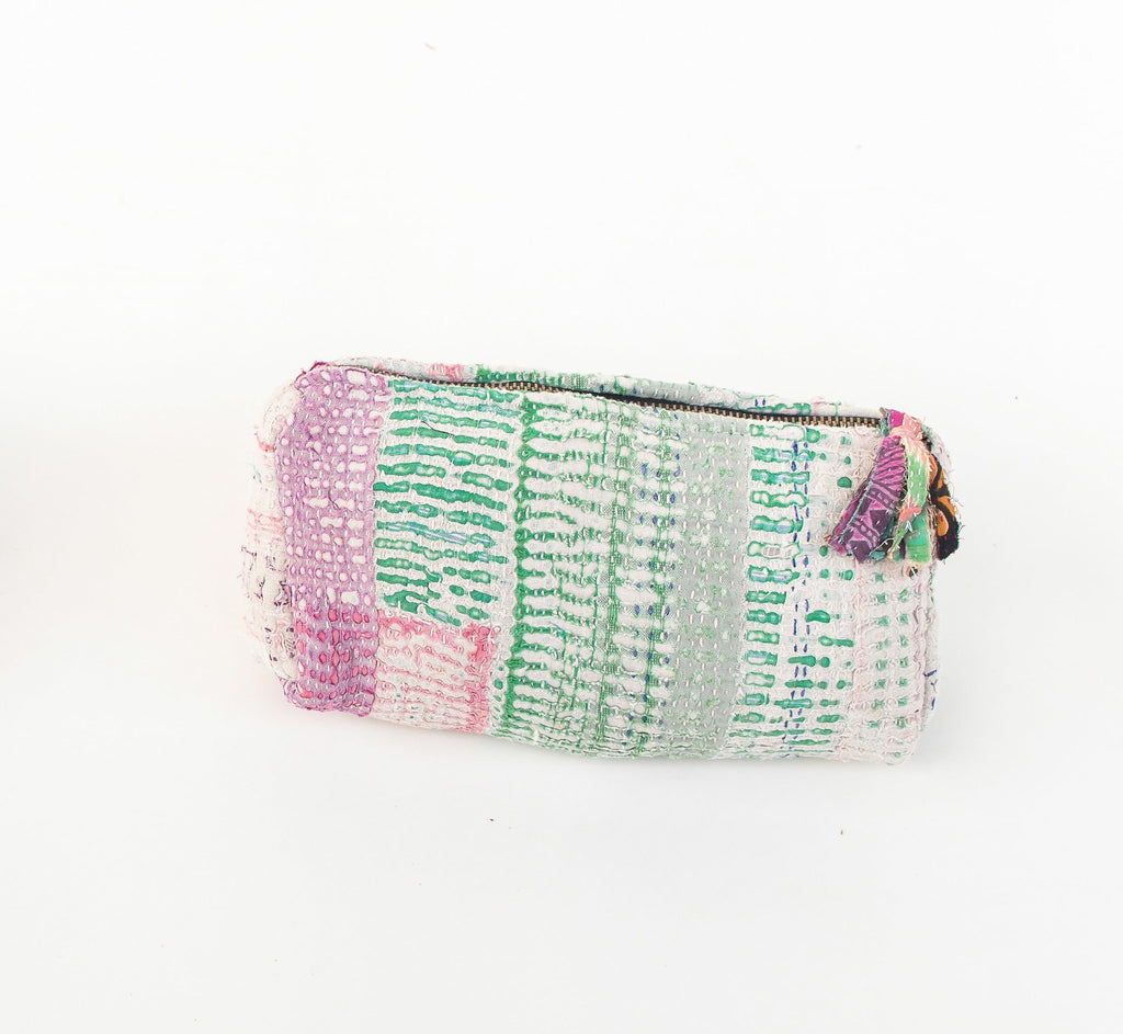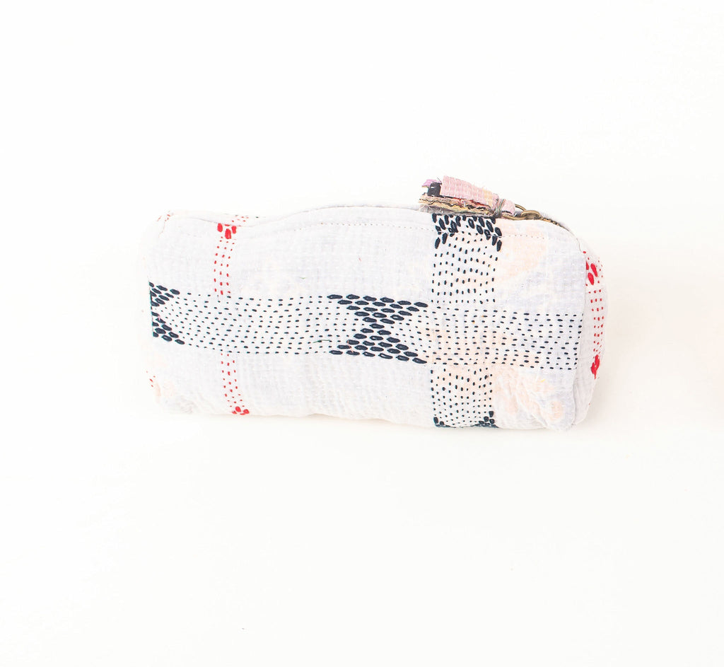 Do you love a light, calm look? Vintage Pearl is our white/cream sari pouch with delicate block print. It gathers your small essentials – makeup, jewelry, keys, and earbuds – and adds a touch of elegant boho charm to your bag. Each pouch is unique, so the one you choose is completely yours.